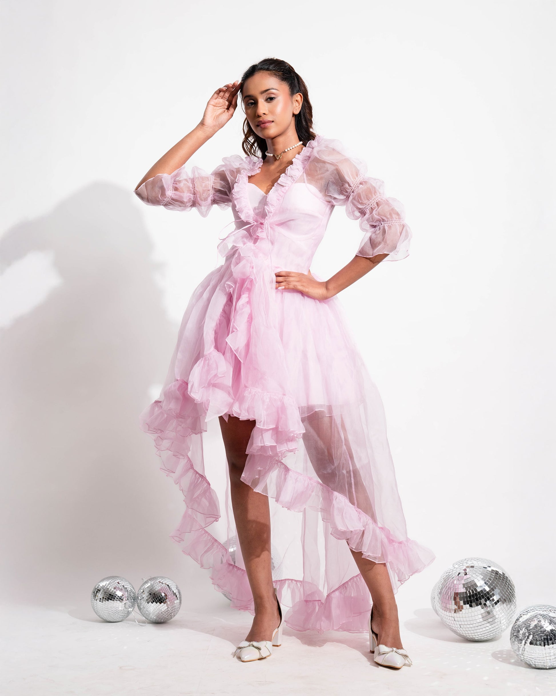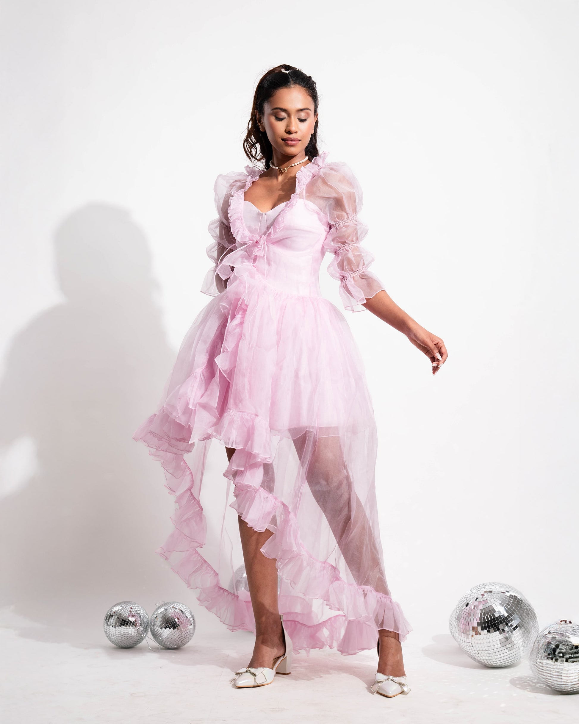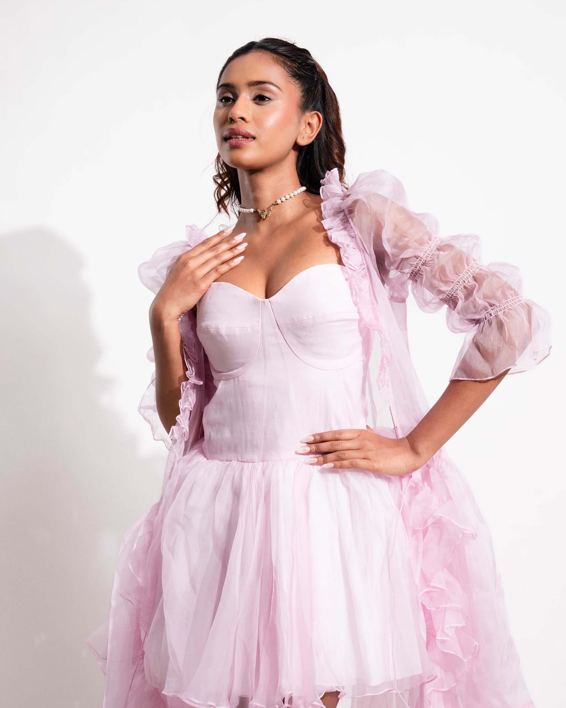 Blush pink organza-silk blend with a structured corset bodice and romantic ruffled puff sleeves.