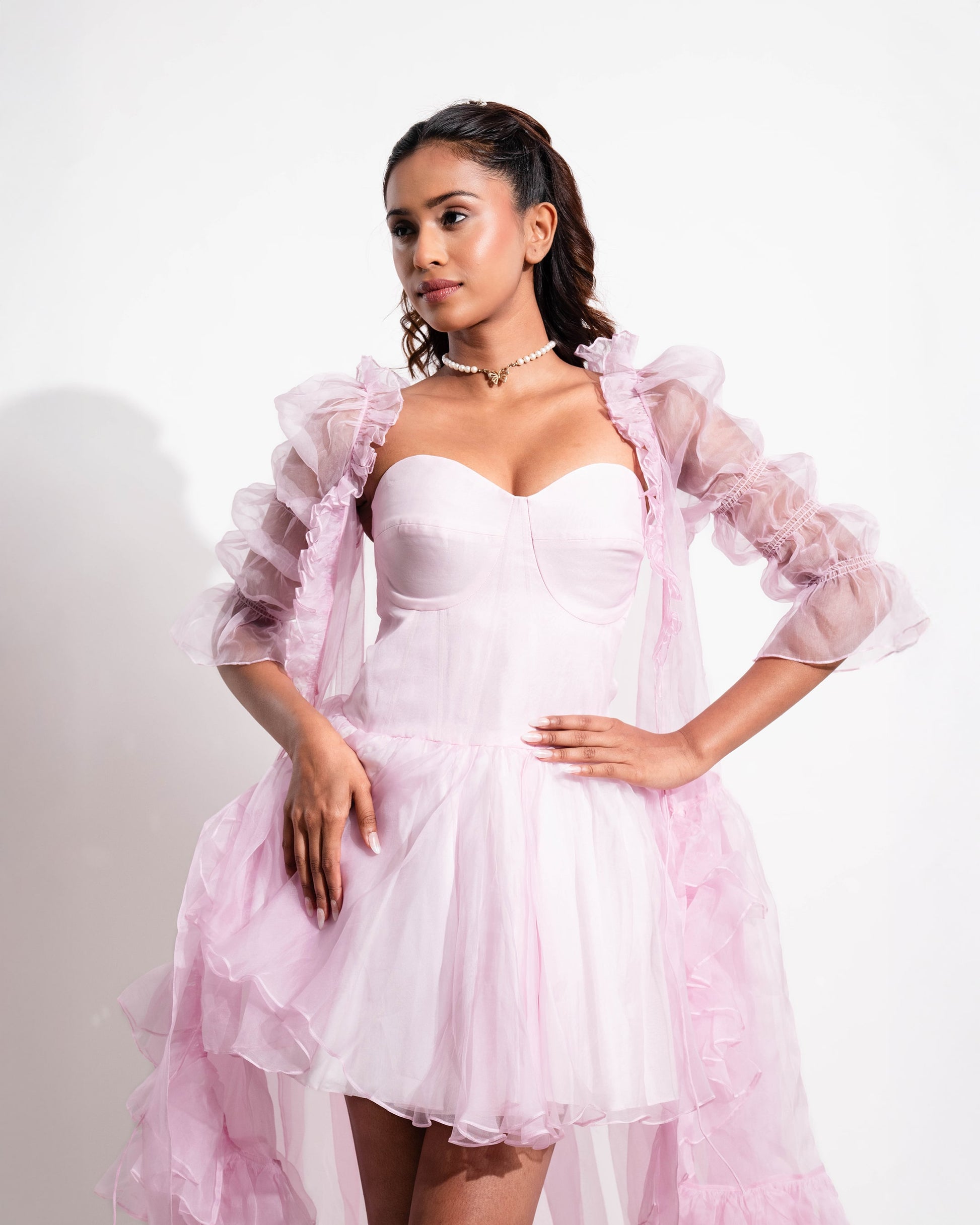 Designed for elegance, this blush pink organza-silk mini dress features a structured corset bodice with a sweetheart neckline. The ruffled puff sleeves add a touch of romance, while the removable coat offers versatile styling. Finished with an eyelet closure at the back for a seamless fit.