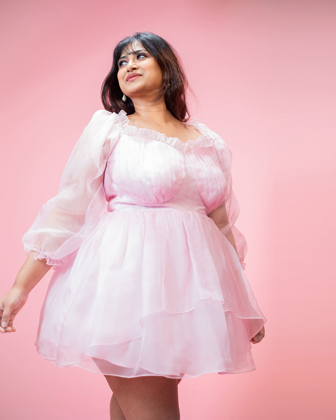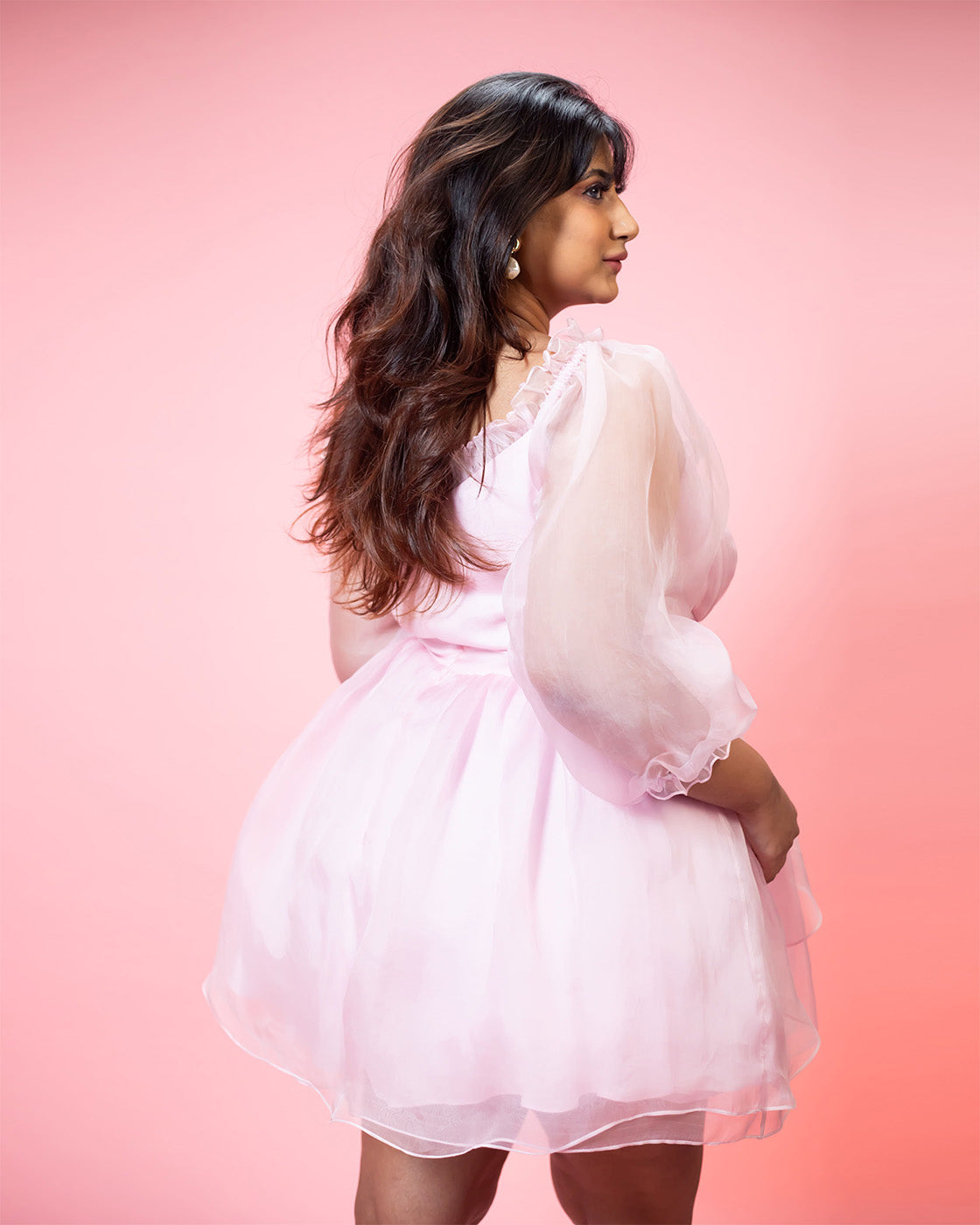 Designed for elegance, this soft pink silk-blend organza dress features a fully lined design with delicate pleats and a ruffled neckline. The sheer, puffed mid-length sleeves with elastic cuffs add a romantic touch, while the voluminous layered skirt, crafted with two layers of tulle, falls gracefully to mid-thigh. A concealed back zipper ensures a seamless finish.