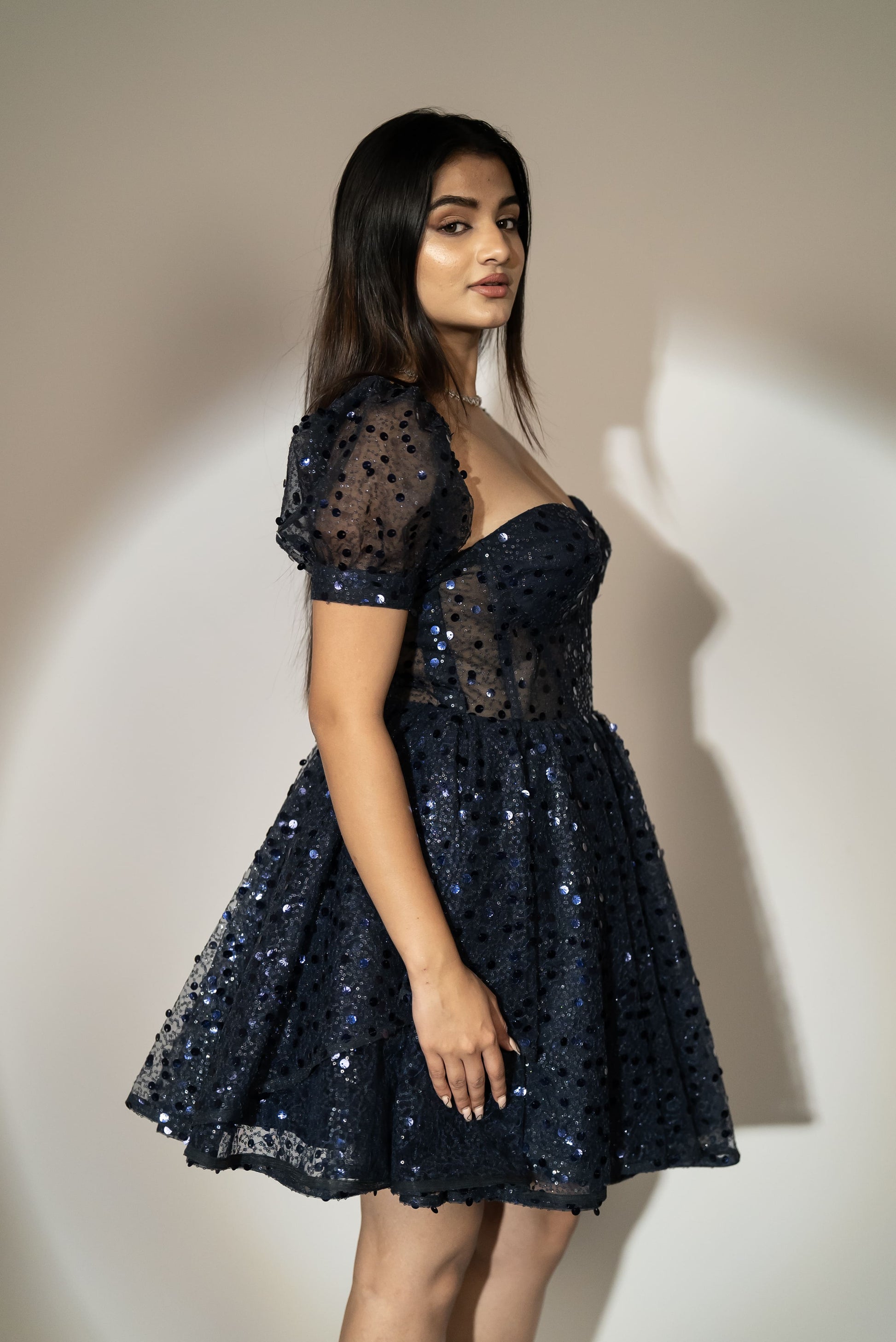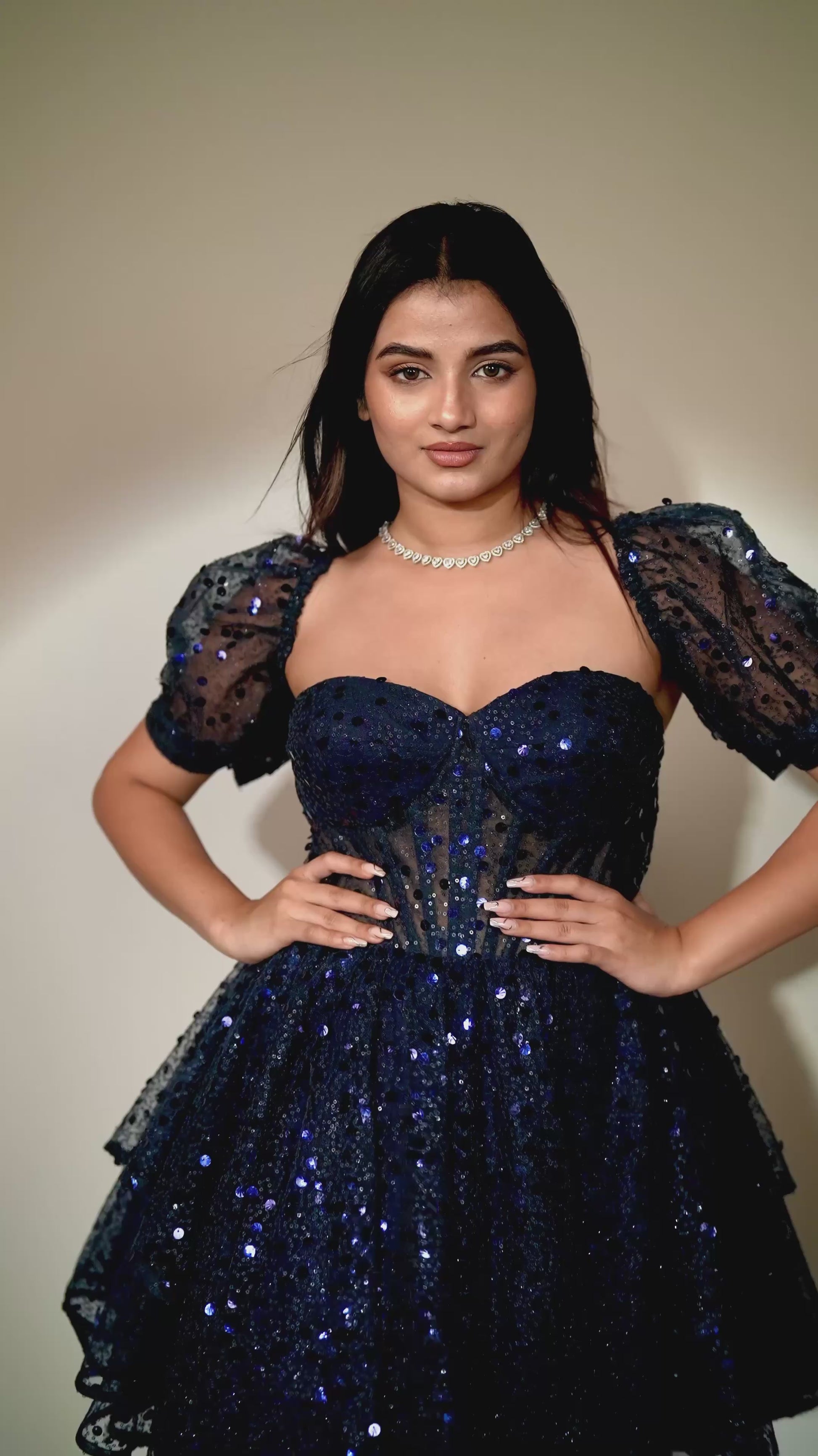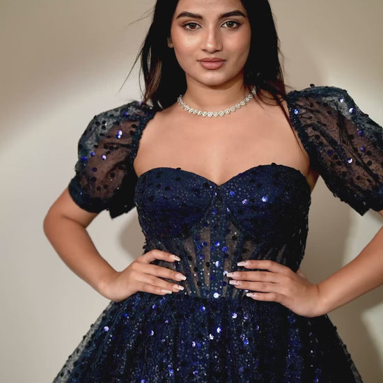 Designed in dark blue sequin net fabric, this dress features a boned corset sheer bodice with a padded bust for structure and support. The puff short sleeves and sweetheart neckline add a romantic touch, while the layered flared skirt creates a dreamy, voluminous silhouette. Finished with an eyelet closure at the back for a secure and refined fit. 💕
