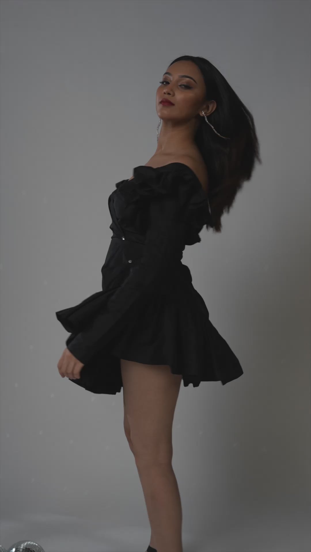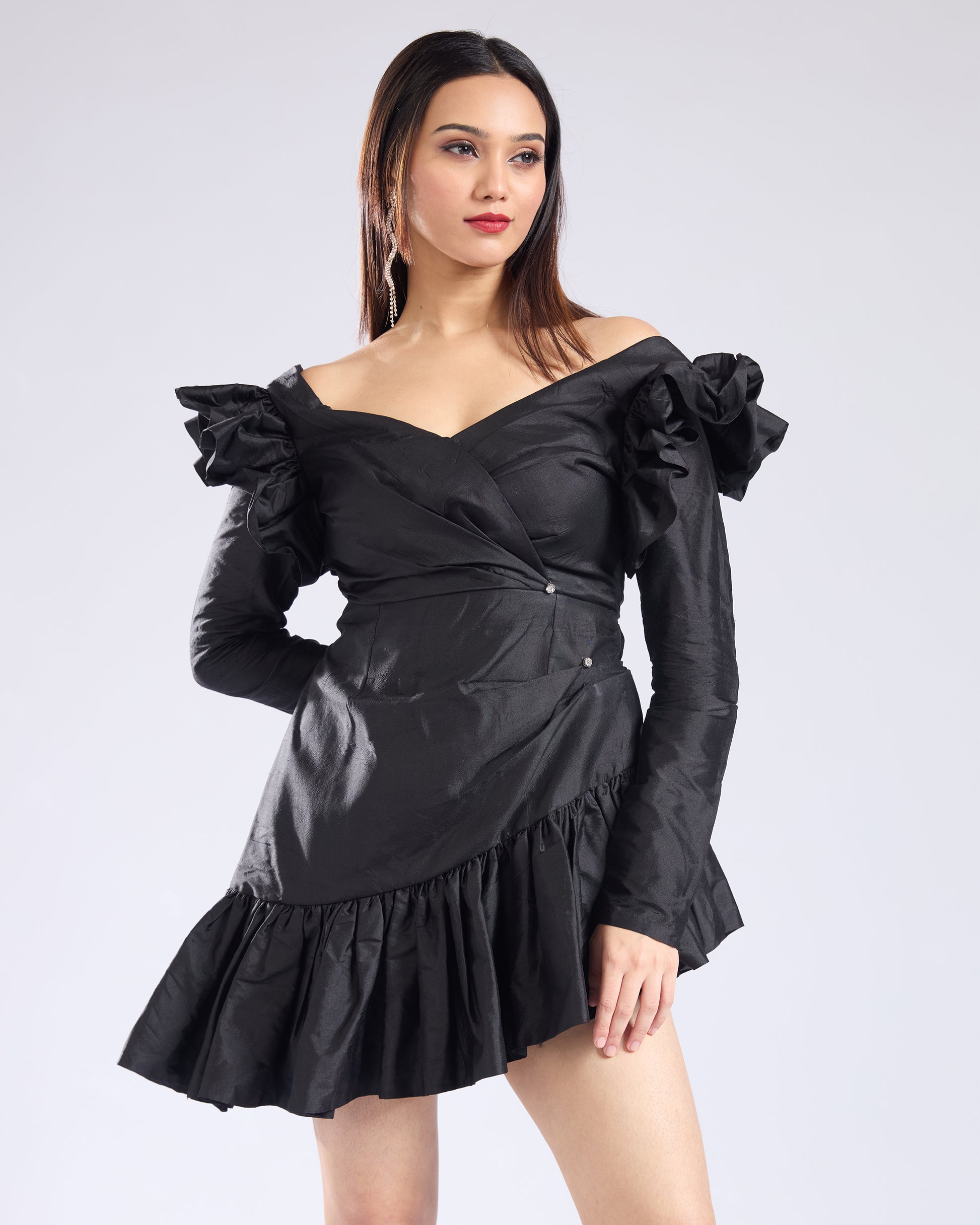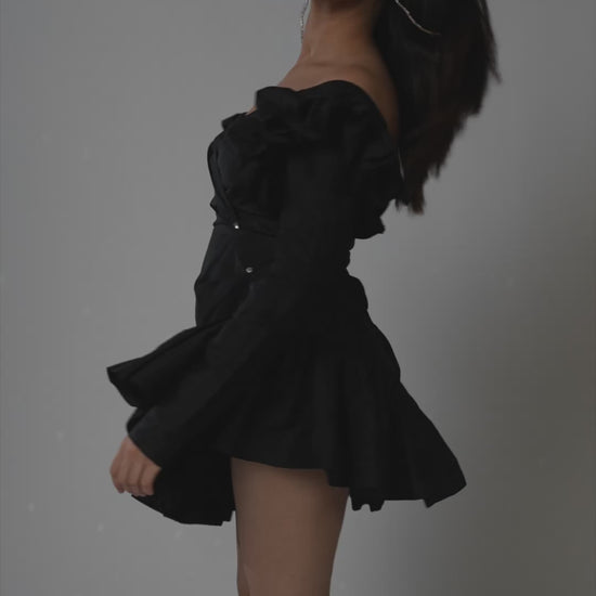 Designed to turn heads, this structured black mini dress blends bold ruffles with timeless elegance. The deep V-neckline and asymmetric hem add a modern edge, while voluminous sleeves bring a dramatic flair to your holiday wardrobe.