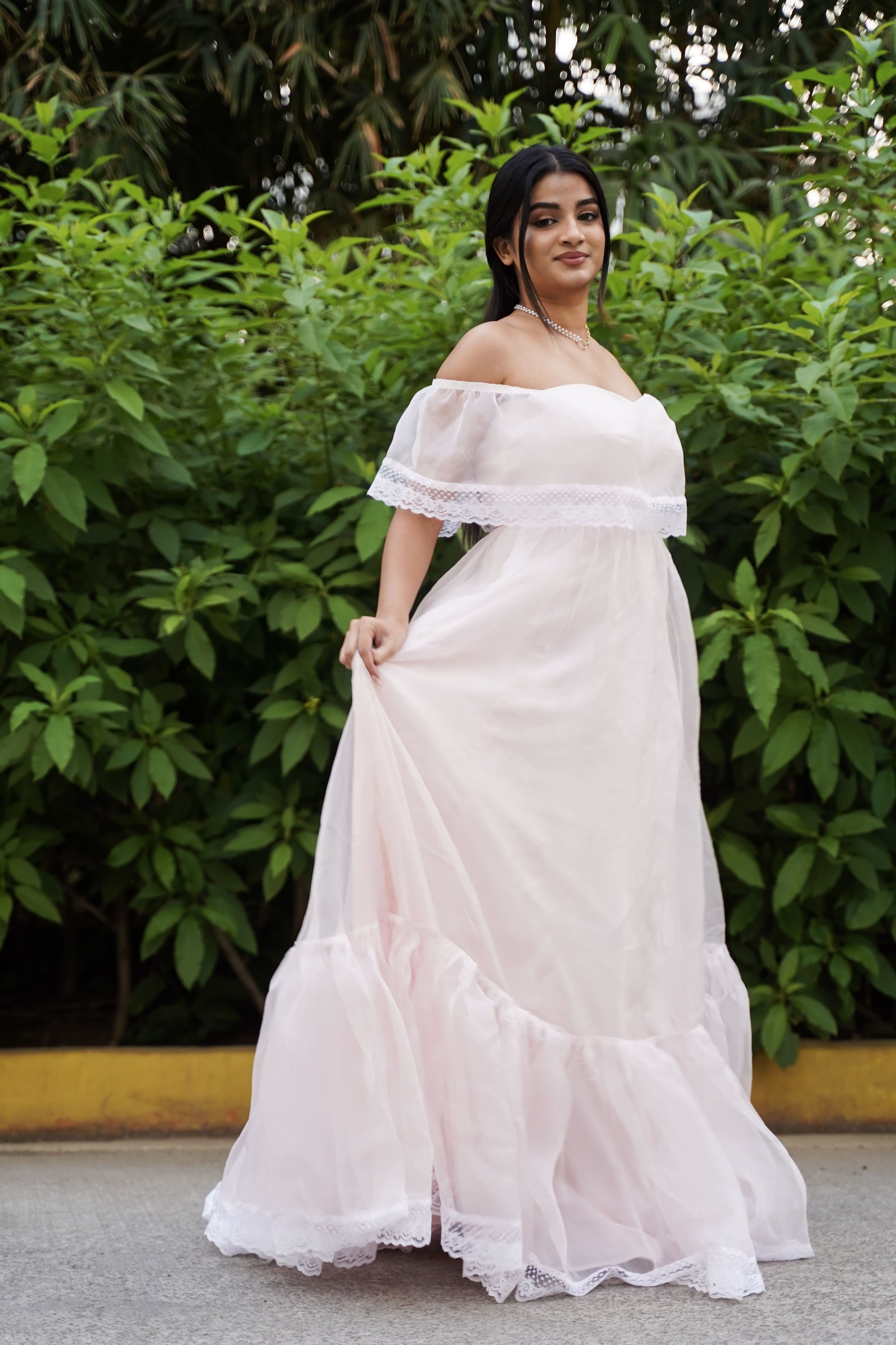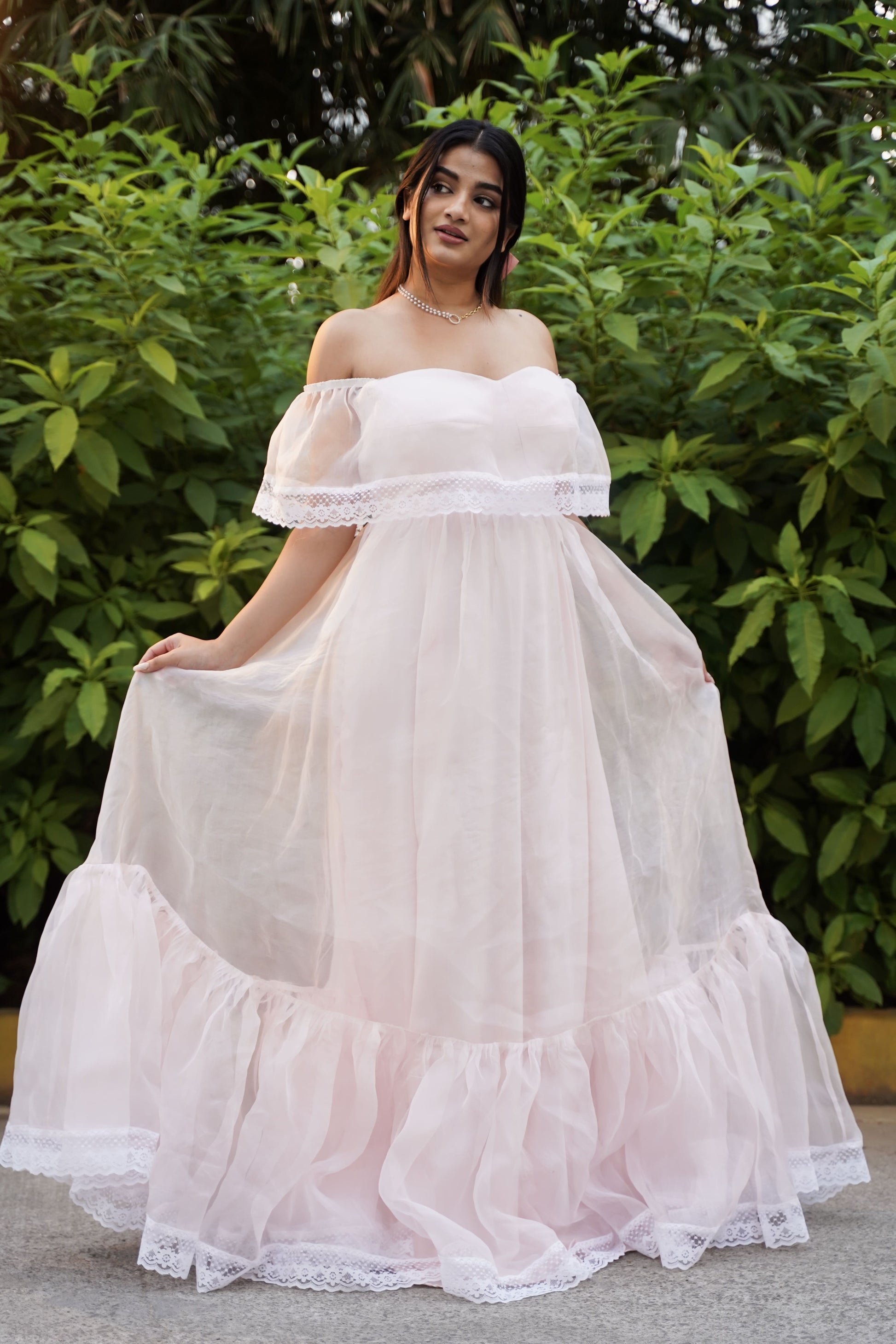 Pale pink silk-blend organza with boned corset, off-shoulder sleeves, and delicate lace trims.