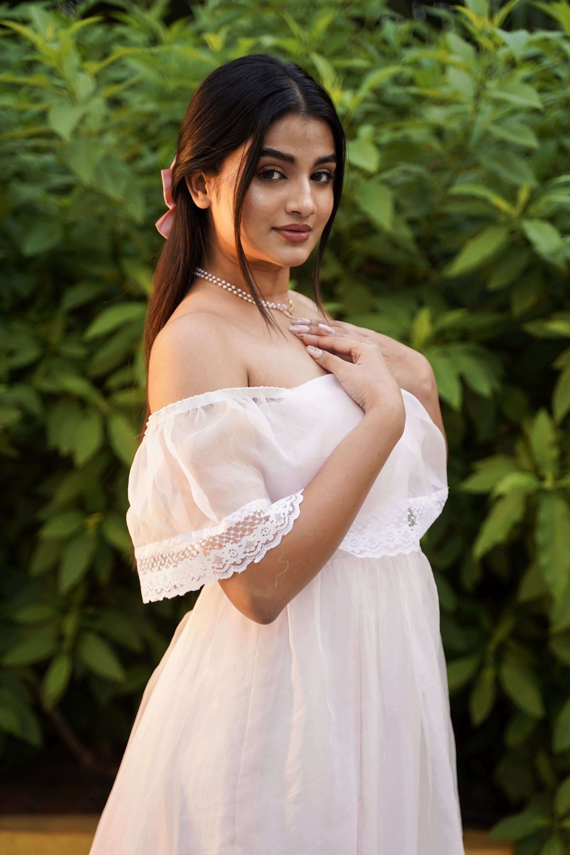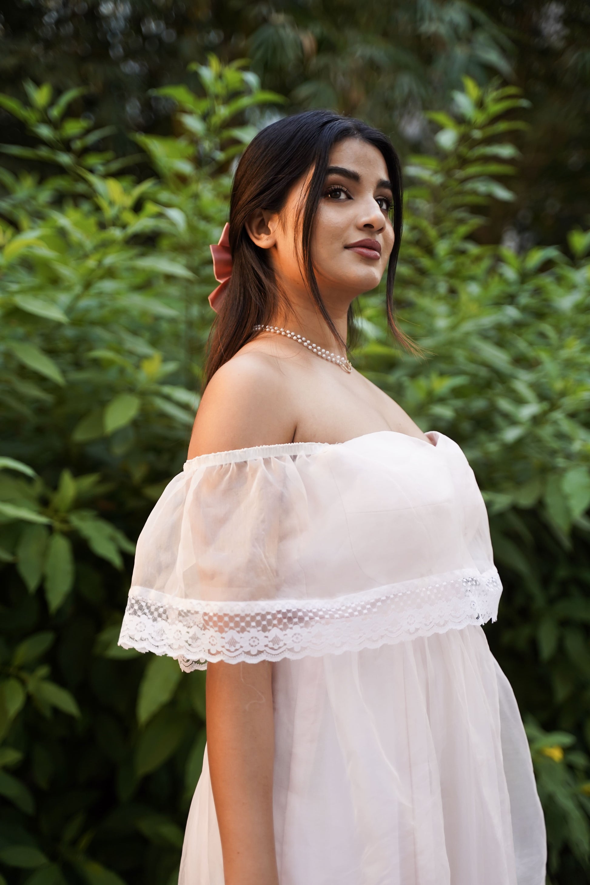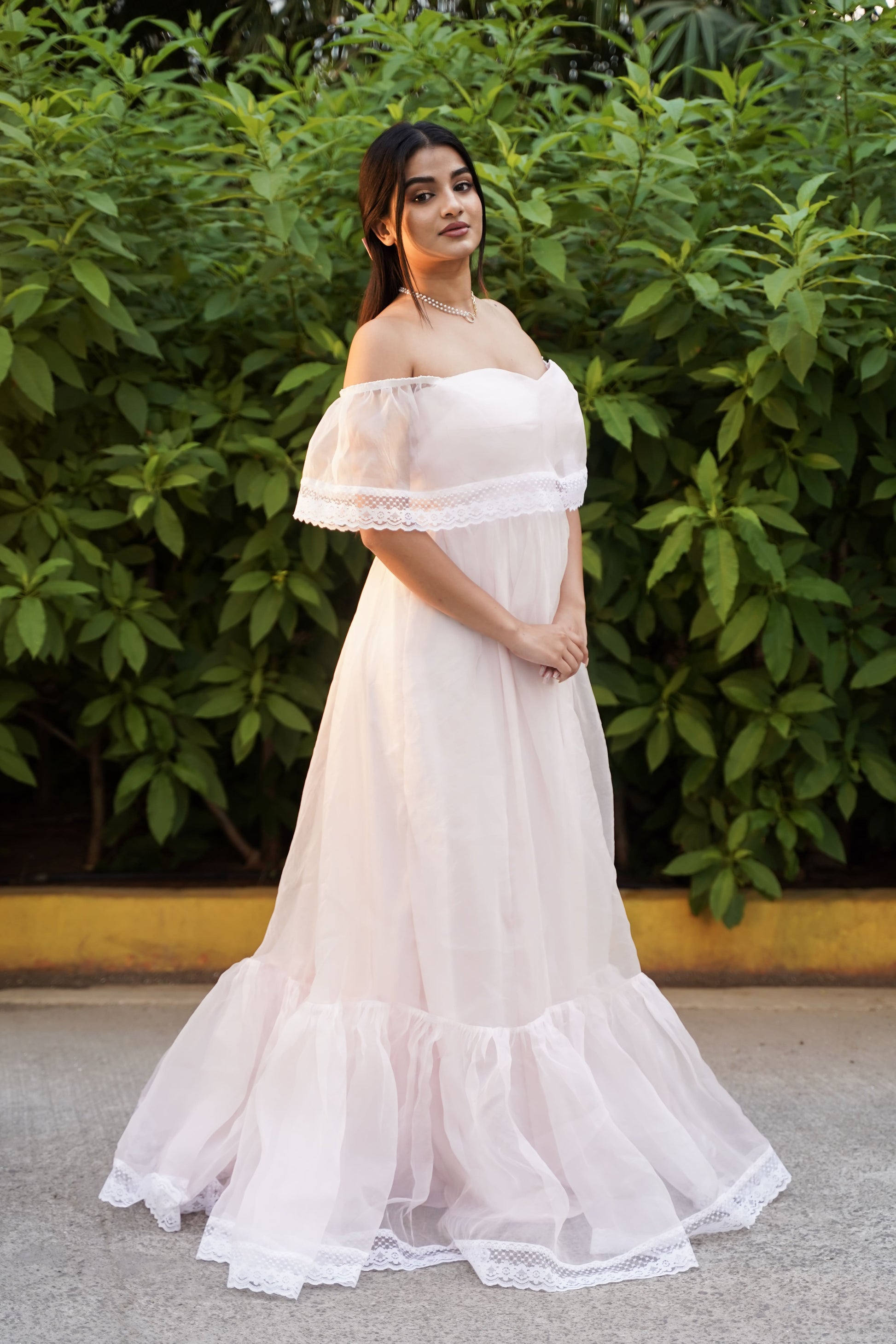 Crafted from pale pink silk-blend organza, this dress features a boned corset bodice and off-shoulder sleeves for a delicate yet striking look. The ruffle overlay with lace trims at the bodice adds a soft, romantic touch, while the voluminous skirt with ruffled lace trims at the bottom creates a graceful flow. Finished with a refined eyelet closure at the back, this dress embodies elegance and charm.✨