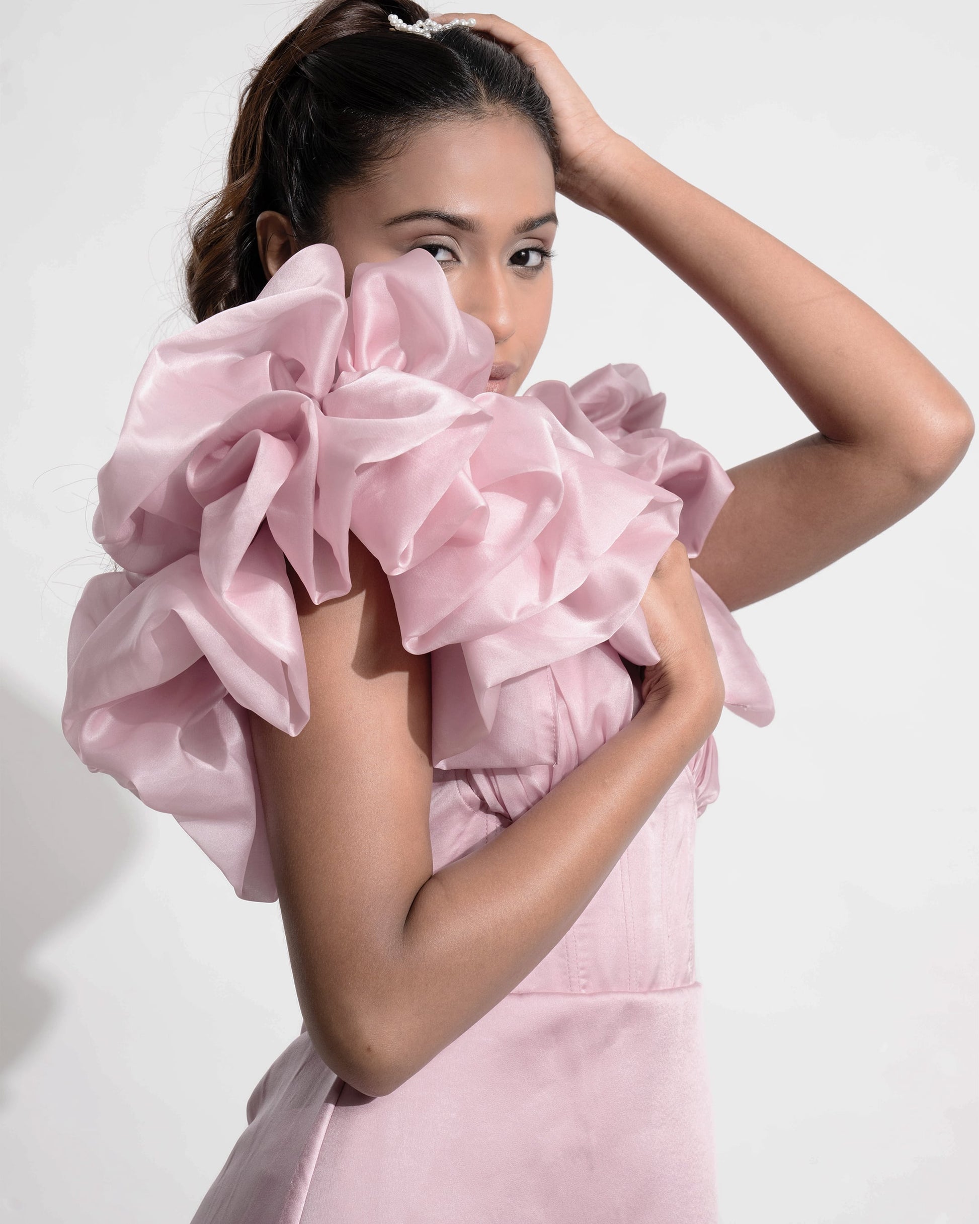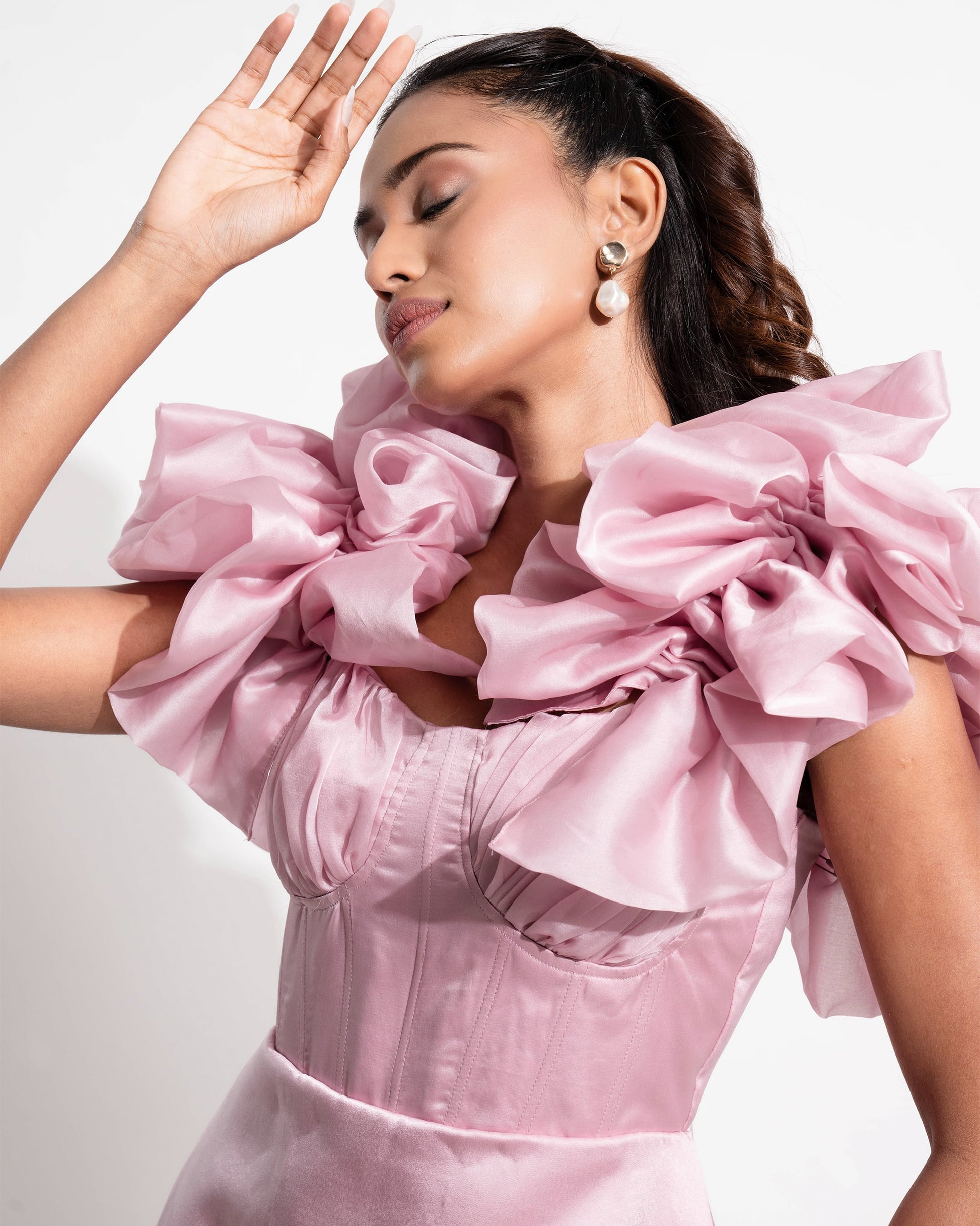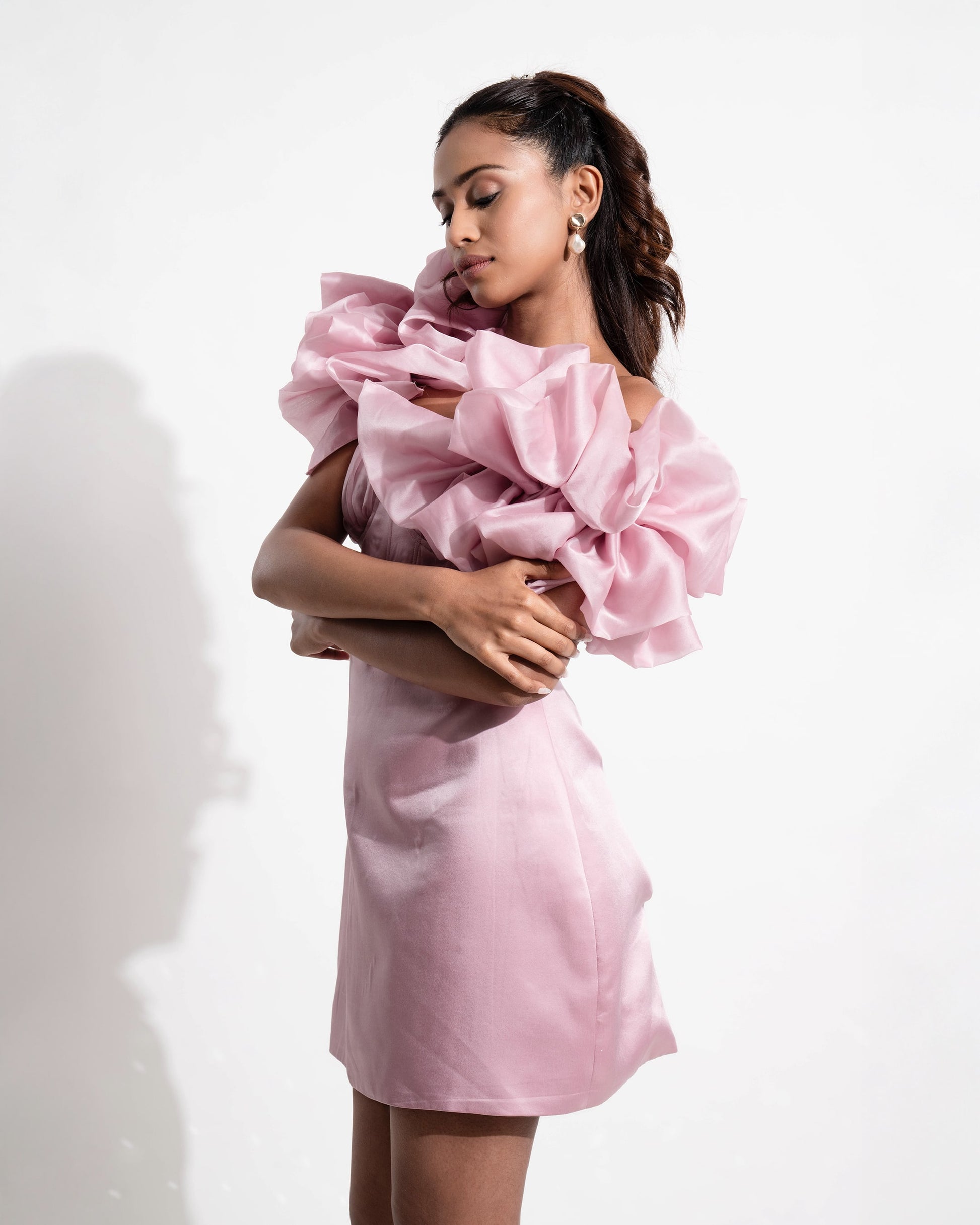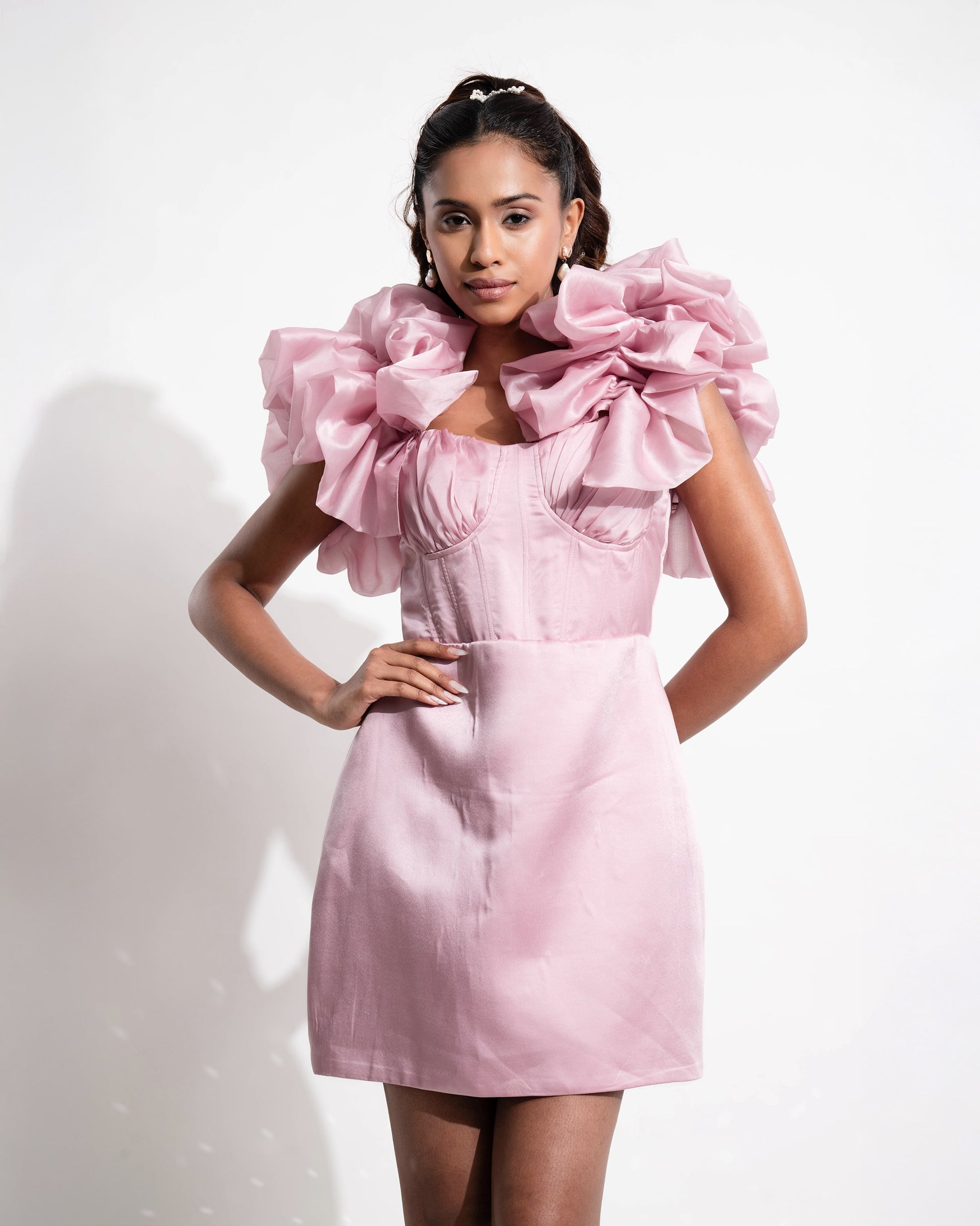 Crafted from a high-quality satin blend, this dress features a sweetheart neckline with pleated bust details and a corset bodice for a structured fit. The statement ruffled sleeves add a bold touch, while the sleek A-line mini skirt completes the chic look. Finished with a concealed back zipper for a smooth silhouette.
