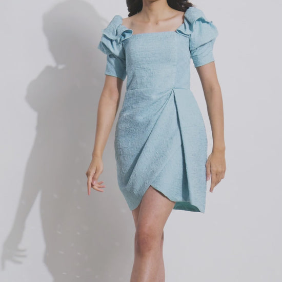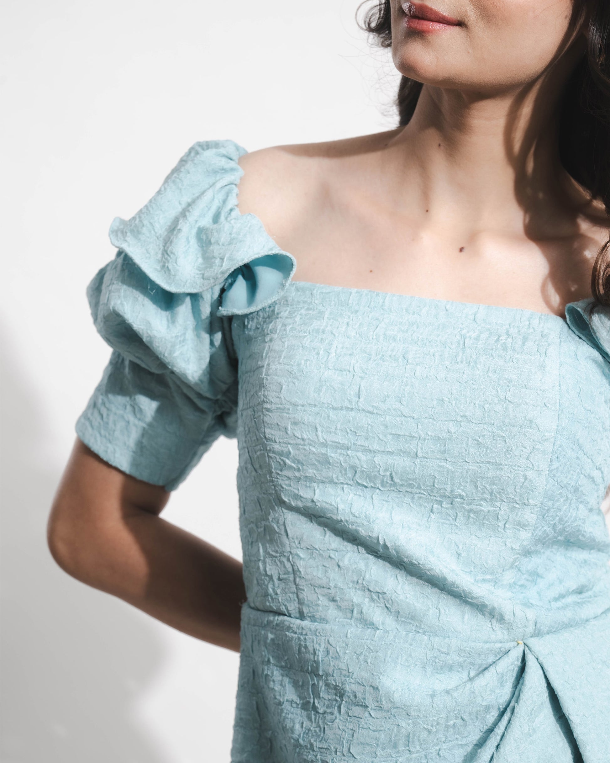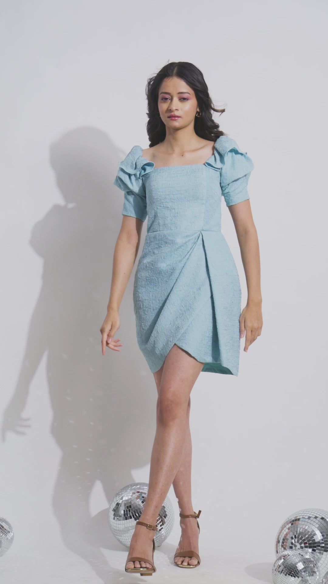 Crafted from high-quality woven aqua fabric, this dress features a flattering square neckline and ruffled puffed sleeves. The fitted bodice provides a structured silhouette, while the wrap-style tulip hem adds movement and elegance. Finished with a concealed back zipper for a seamless look.