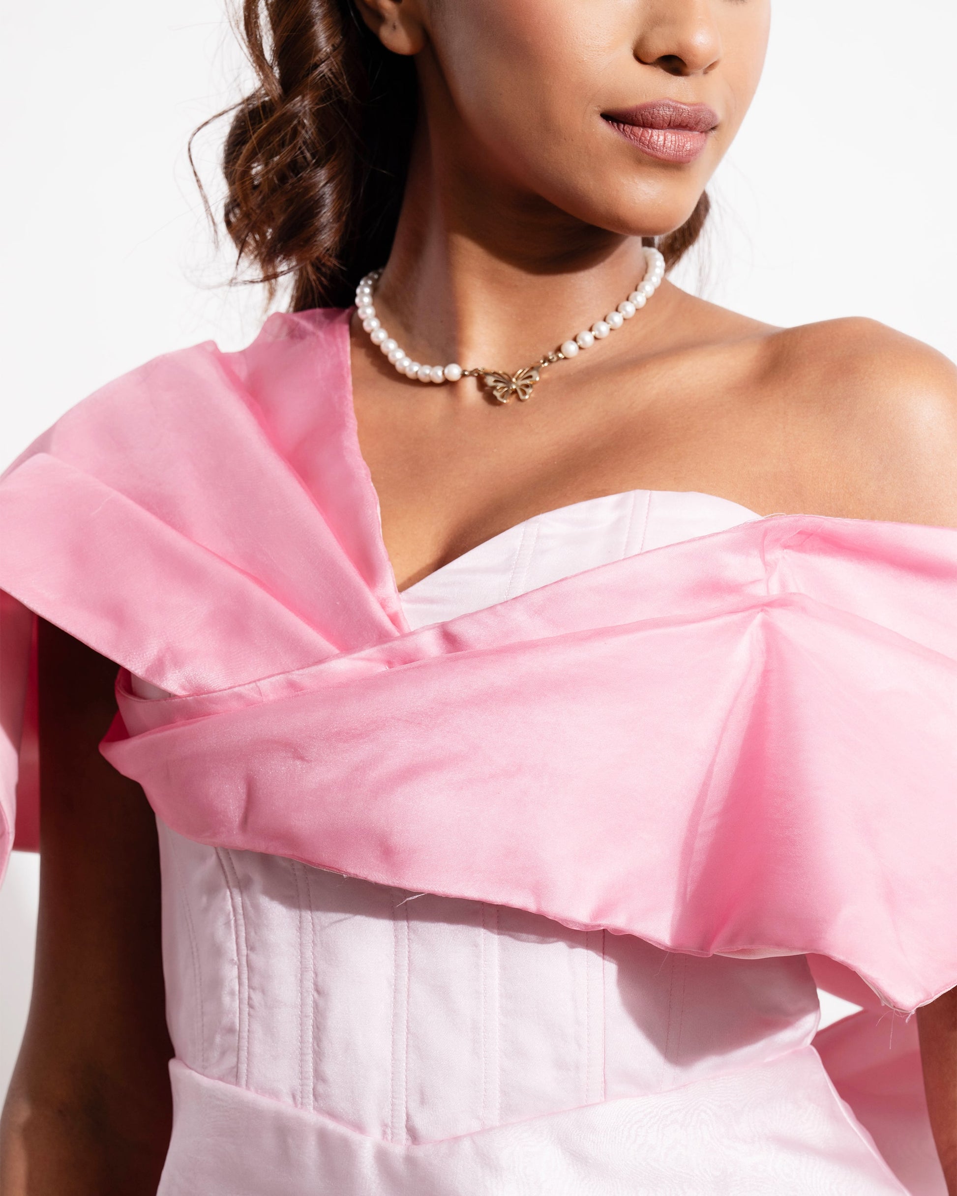 Crafted from luxurious satin fabric, this dress features a flattering off-shoulder draped bodice and a structured corset design. The mini-length silhouette is complemented by a statement oversized bow at the back, adding a bold touch of drama. Finished with a concealed back zipper for a seamless, polished look.