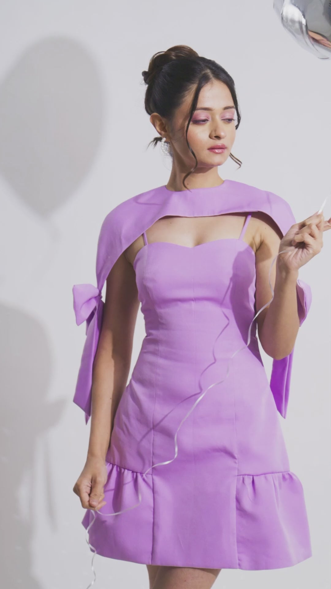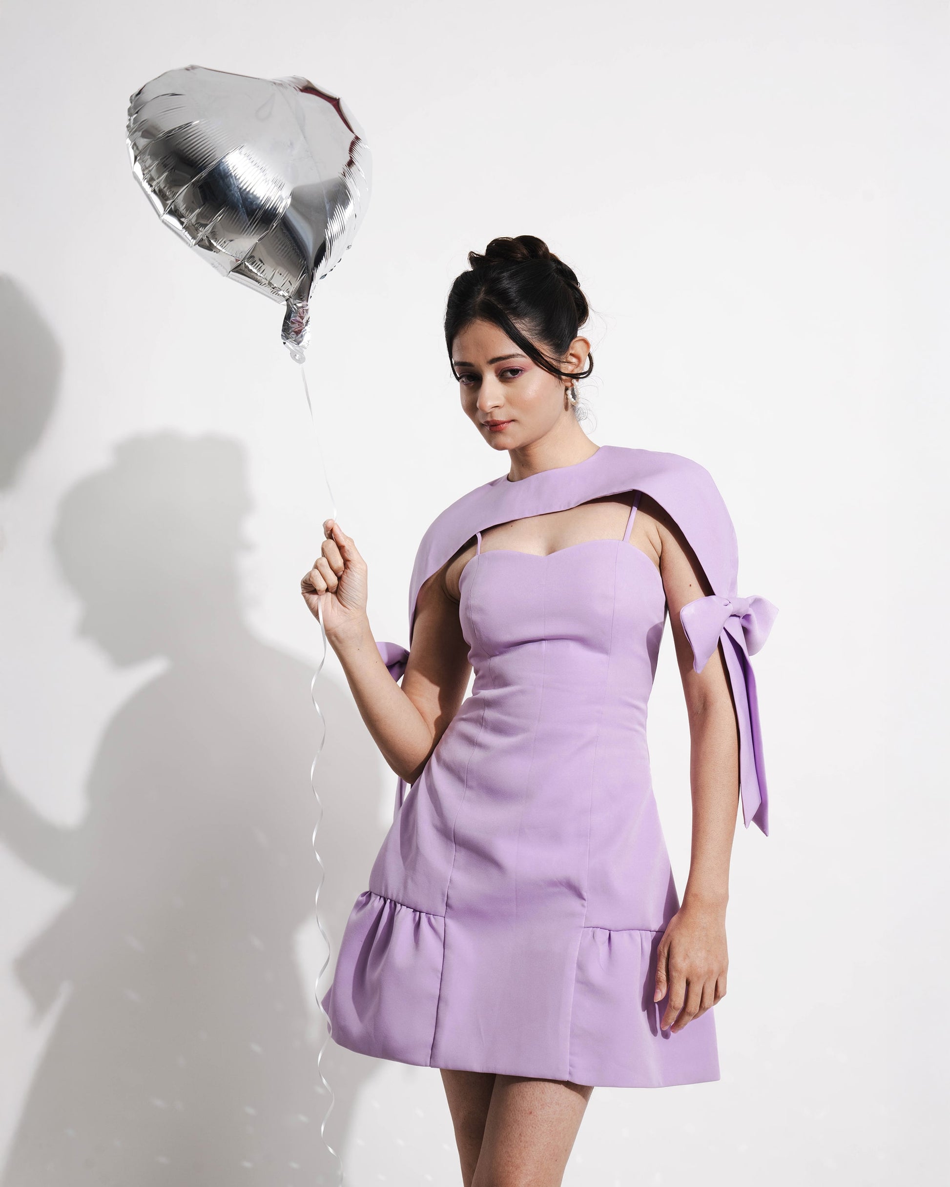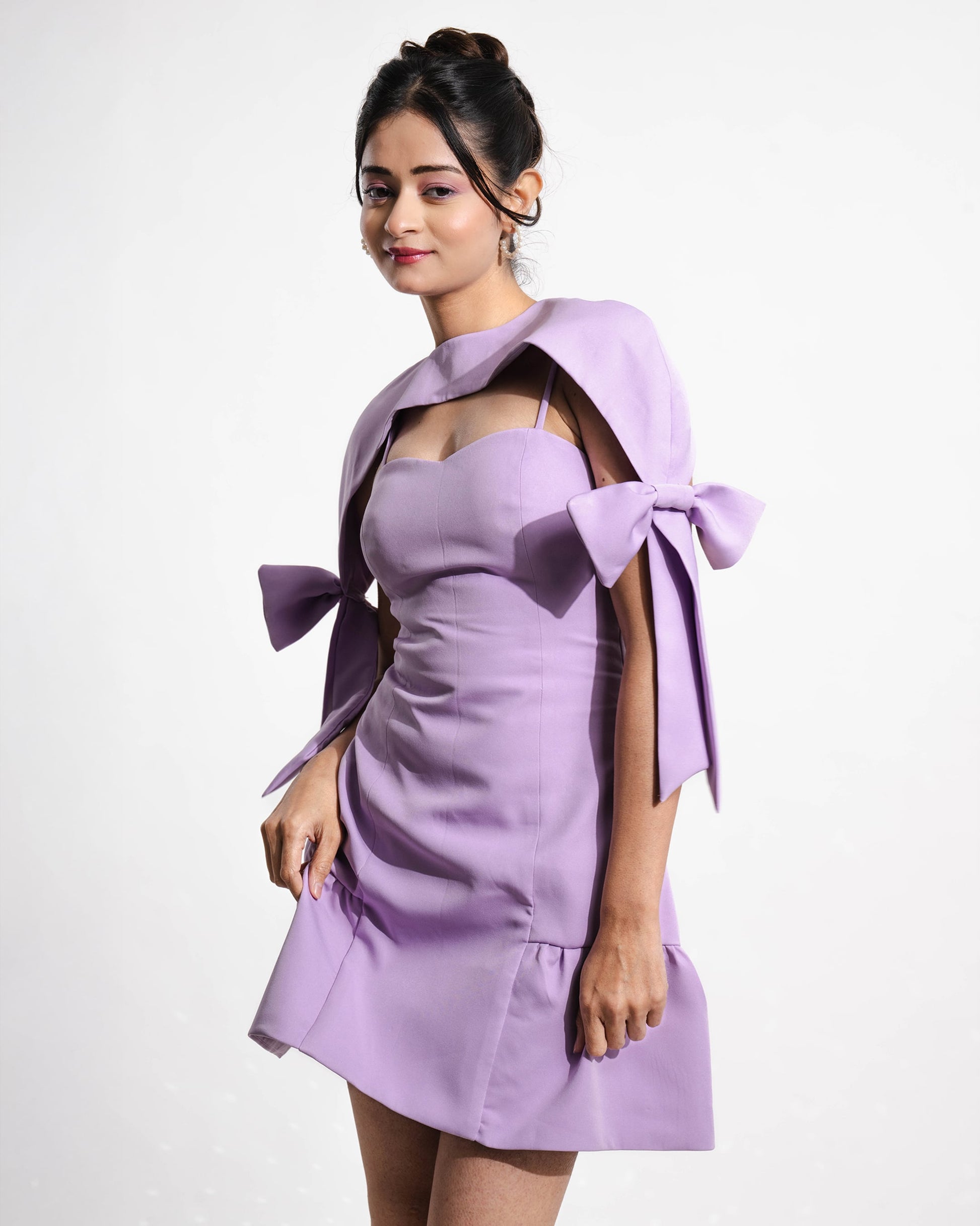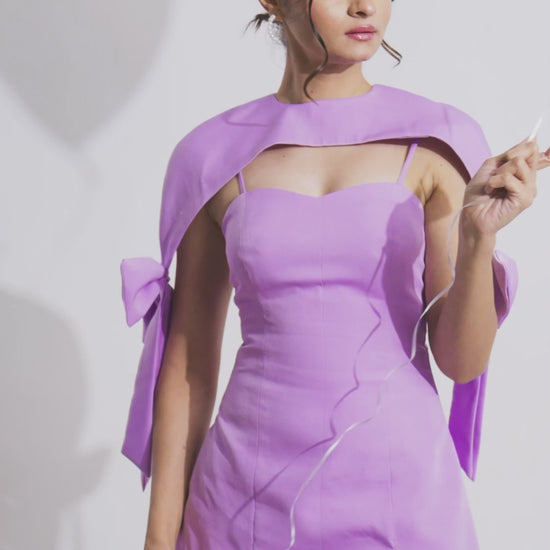 Crafted from soft lavender crepe, this dress features a sweetheart neckline with delicate spaghetti straps. The cape-style drape, accented with a chic bow, enhances its elegant design. The fitted bodice sculpts a flattering silhouette, while the tiered hemline offers added volume and movement. Finished with a concealed back zipper for a seamless look. Ideal for special moments.