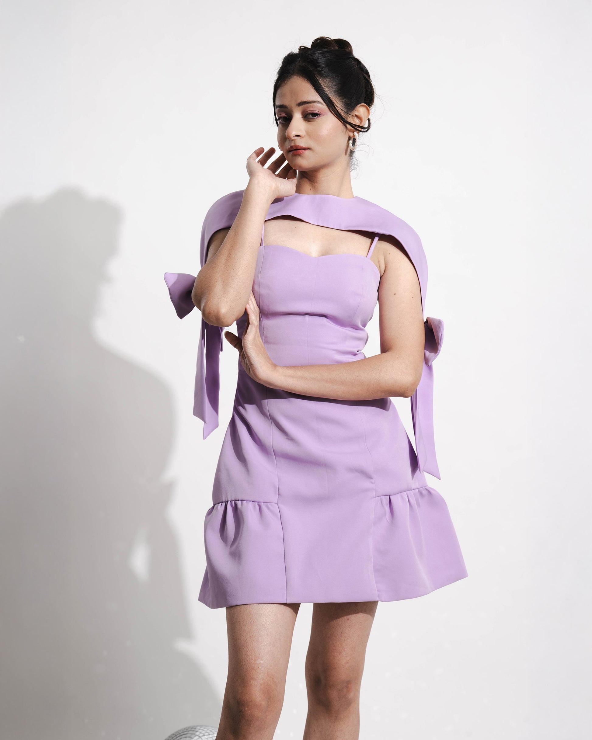 Crafted from soft lavender crepe with a chic bow accent and tiered hemline.