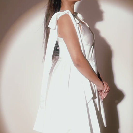 Crafted from premium satin fabric with pearl embellishments, this dress features a flattering square neckline and delicate petal straps. The tailored bodice and mini-length silhouette offer a chic, feminine fit, while the asymmetrical ruffled overlay adds a touch of dynamic flair. The concealed back zipper ensures a smooth, seamless look.