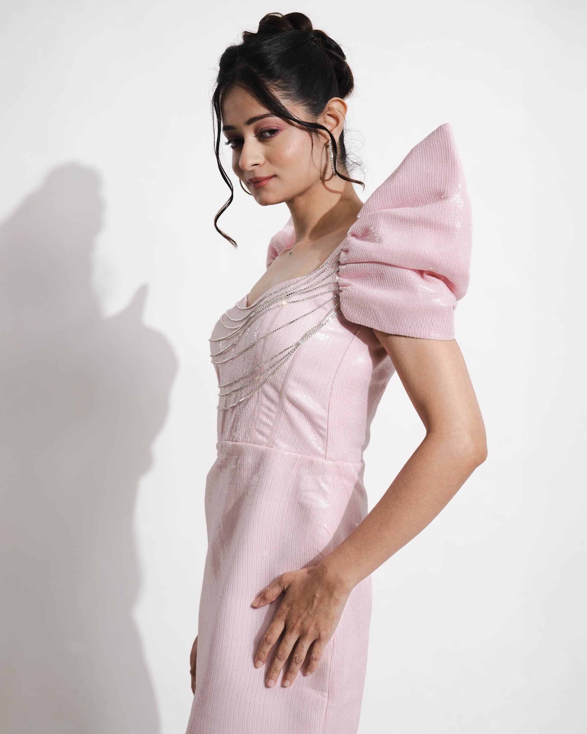 Crafted from high-quality sequin fabric, this gown features a sweetheart neckline and stone chain accessories for a luxurious touch. The corset bodice creates a flattering shape, while dramatic puff sleeves make a bold statement. With a body-hugging silhouette and concealed back zipper, this design is both structured and seamless for a stunning finish.